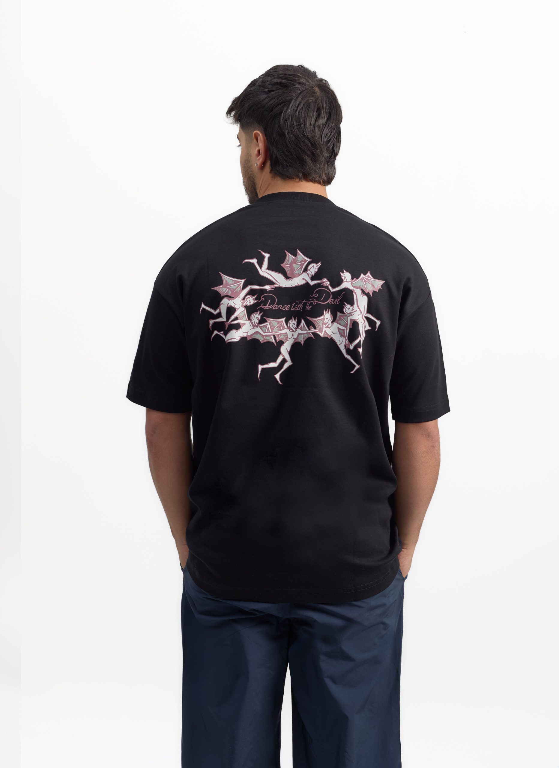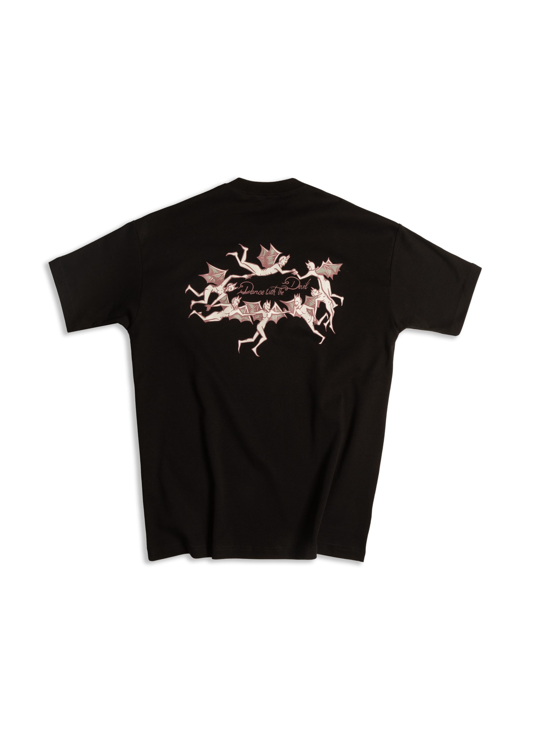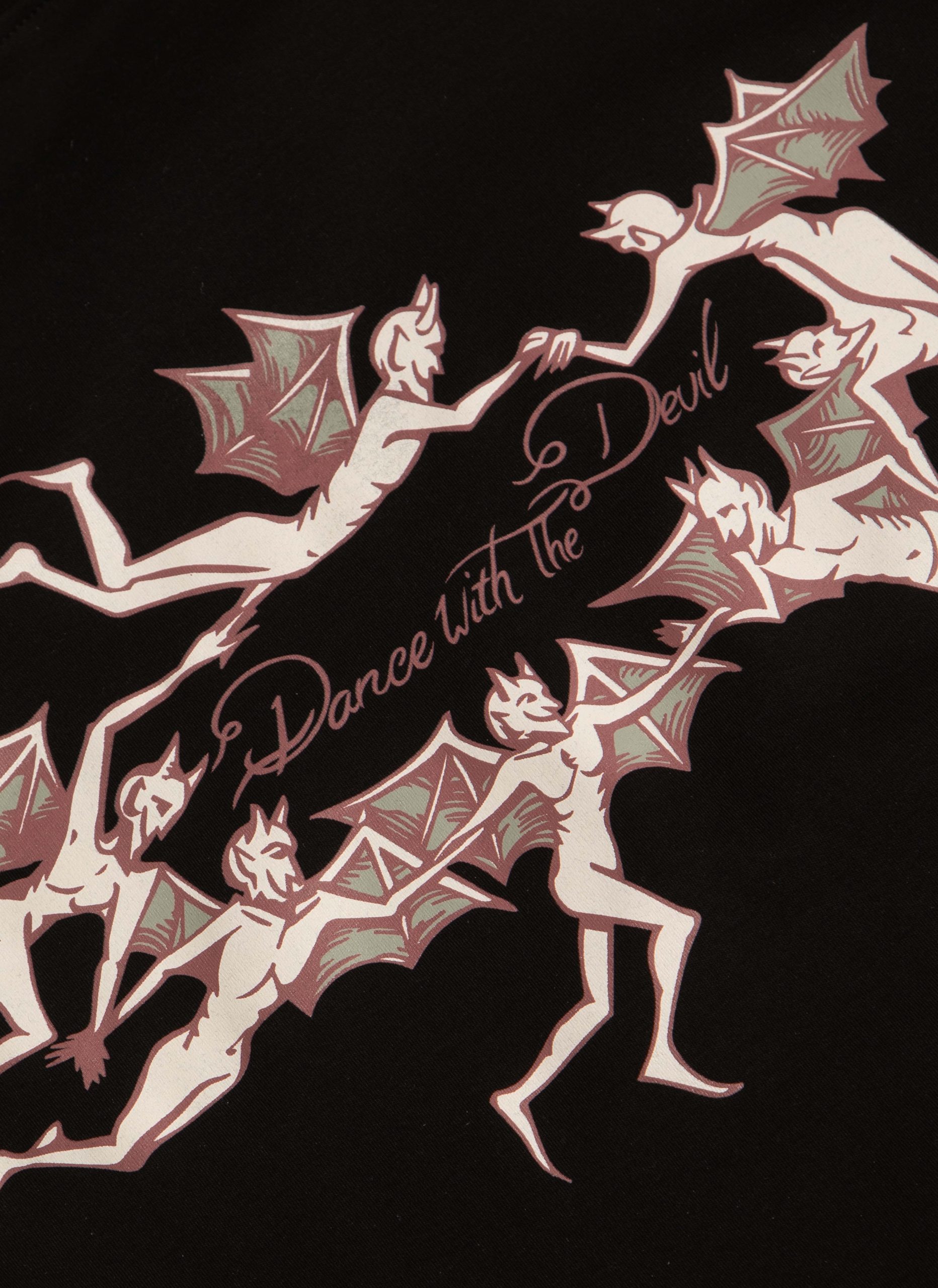 The Devil’s Loop T-Shirt is inspired by a “Madness” collection that views chaos not as destruction, but as a shared state of freedom. The back graphic features smiling winged devils dancing in a closed circle, hand in hand — a loop without beginning or end. Their grins soften the idea of rebellion, turning it into something rhythmic and almost ritualistic. The design reflects the beauty of collective madness, where disorder becomes unity and mischief becomes movement