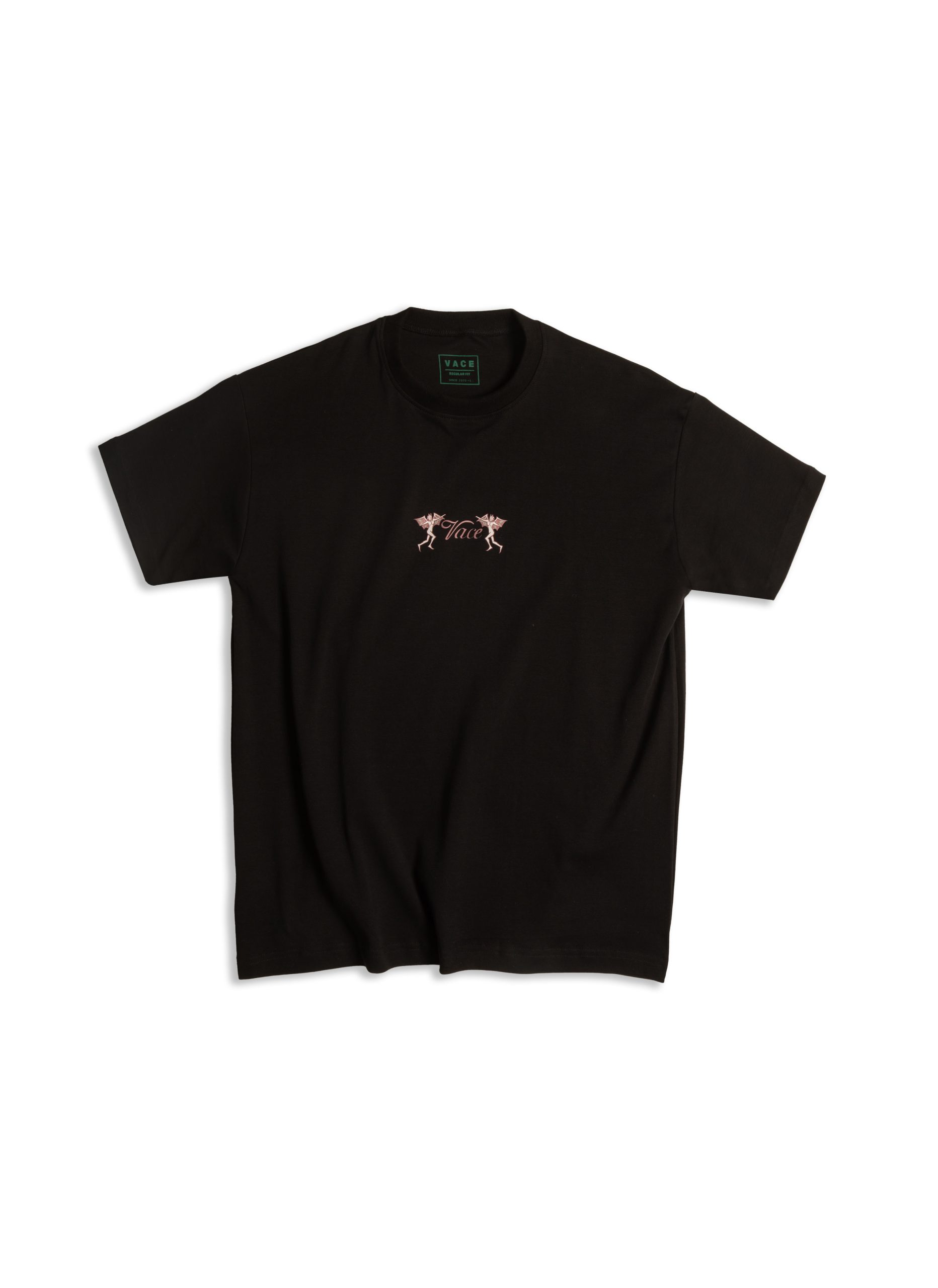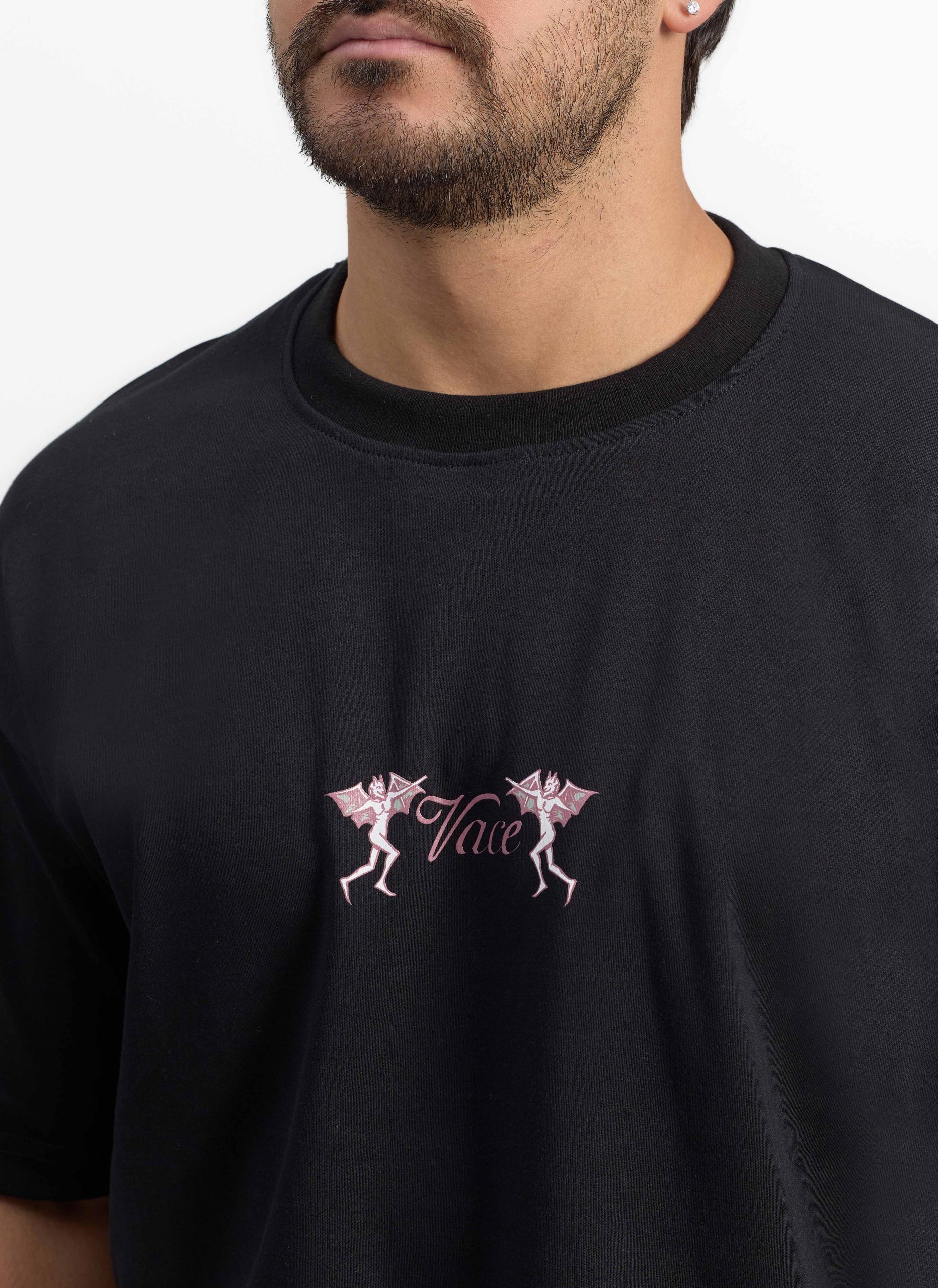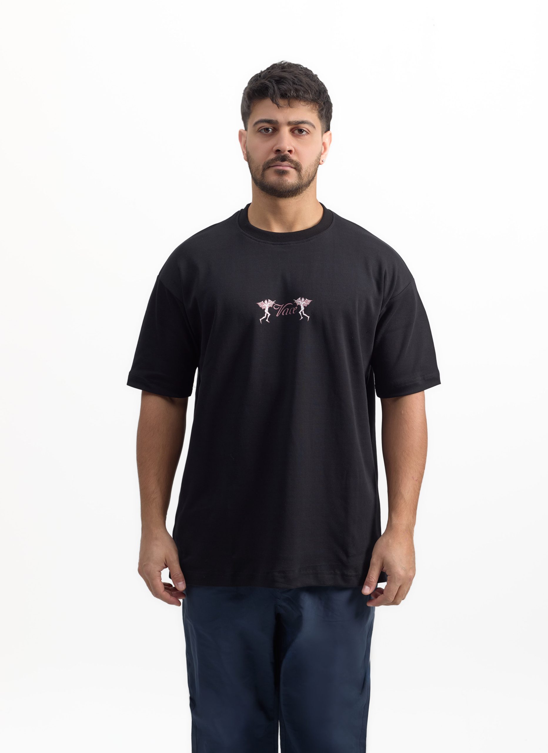 The Devil’s Loop T-Shirt is inspired by a “Madness” collection that views chaos not as destruction, but as a shared state of freedom. The back graphic features smiling winged devils dancing in a closed circle, hand in hand — a loop without beginning or end. Their grins soften the idea of rebellion, turning it into something rhythmic and almost ritualistic. The design reflects the beauty of collective madness, where disorder becomes unity and mischief becomes movement