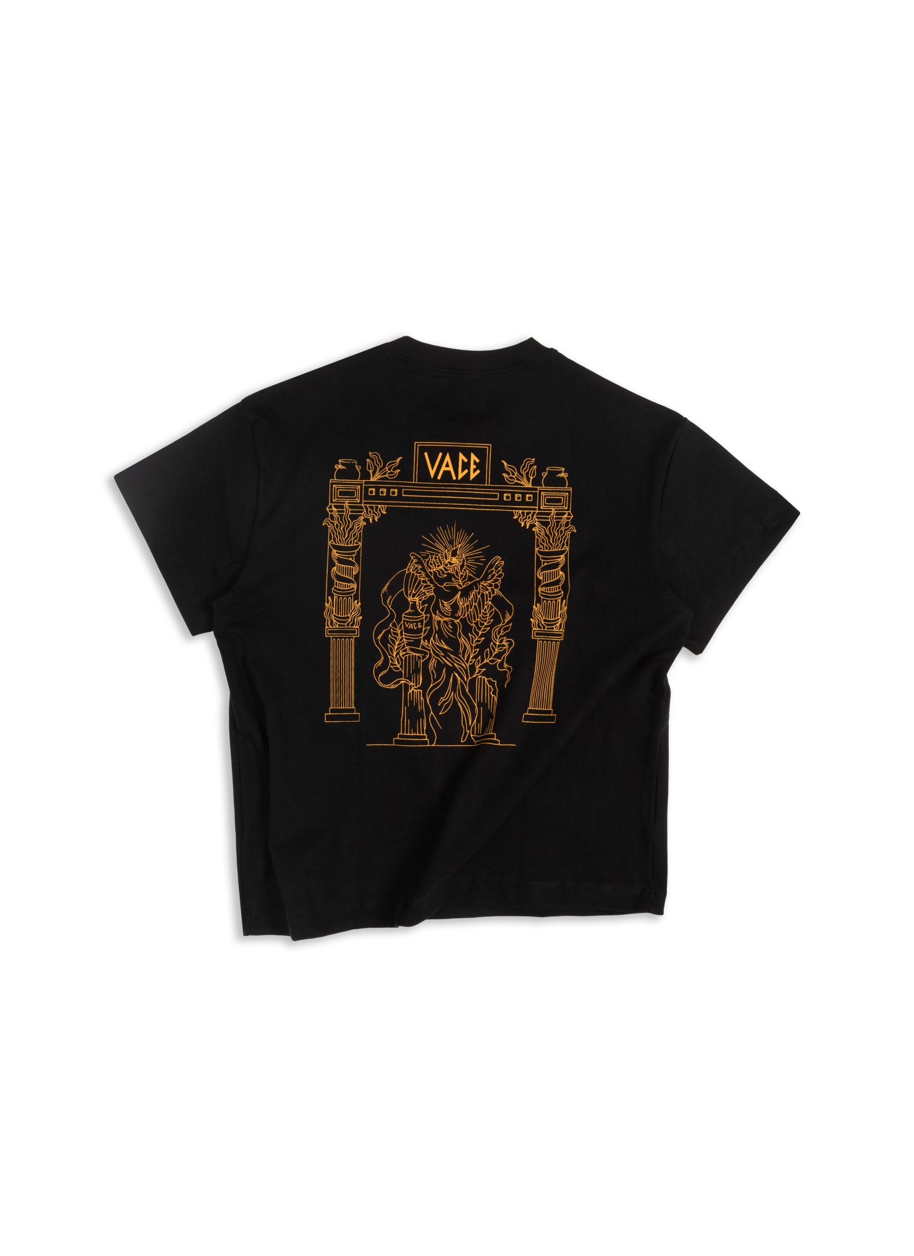 The Samothrace T-shirt which is a part of our “GREECE” collection features a silk-print graphic on the back inspired by the Sanctuary of the Great Gods, the ancient temple complex on the island of Samothrace. The design references the sacred architecture and ceremonial atmosphere associated with the mystery rites practiced there, central to aspects of Ancient Greece religious life. Subtle elements within the artwork echo stone columns, elevated terraces, and symbolic motifs connected to ancient Greek mythology. Set against a plain black base, the graphic stands out while maintaining a minimal and understated look.